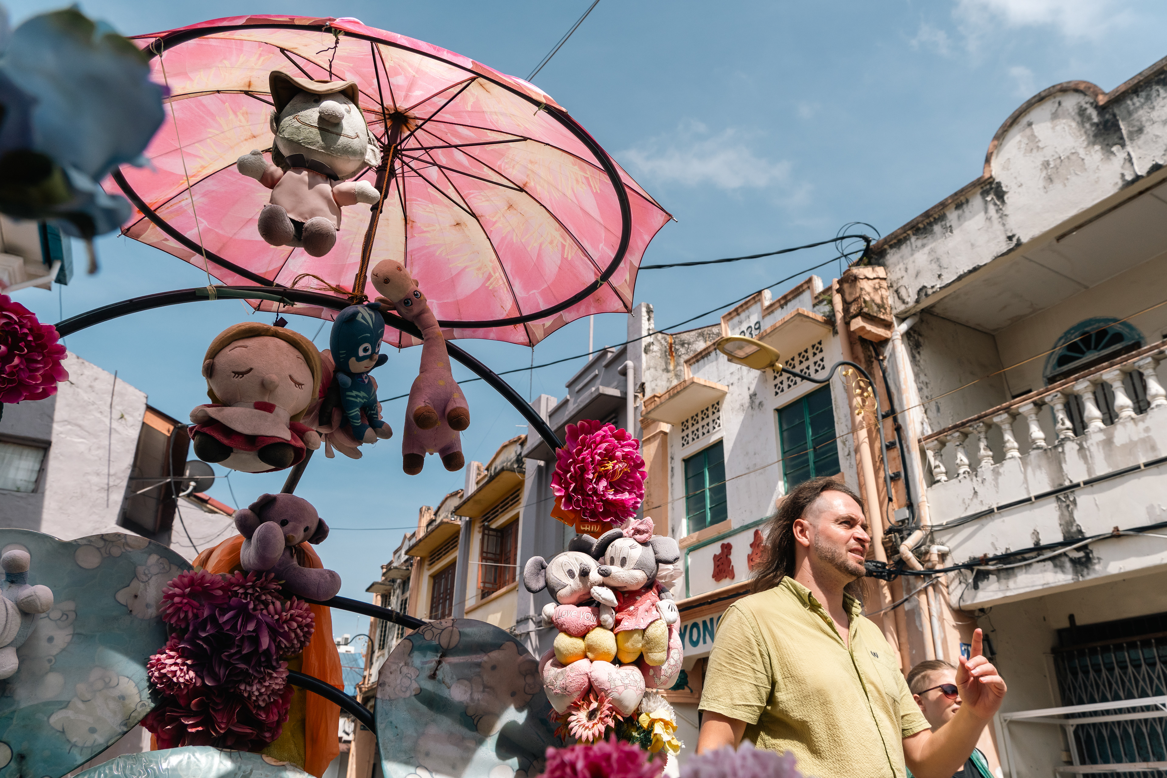 Rickshaw full of Dolls with a tourist passing by. Malacca, Malaysia